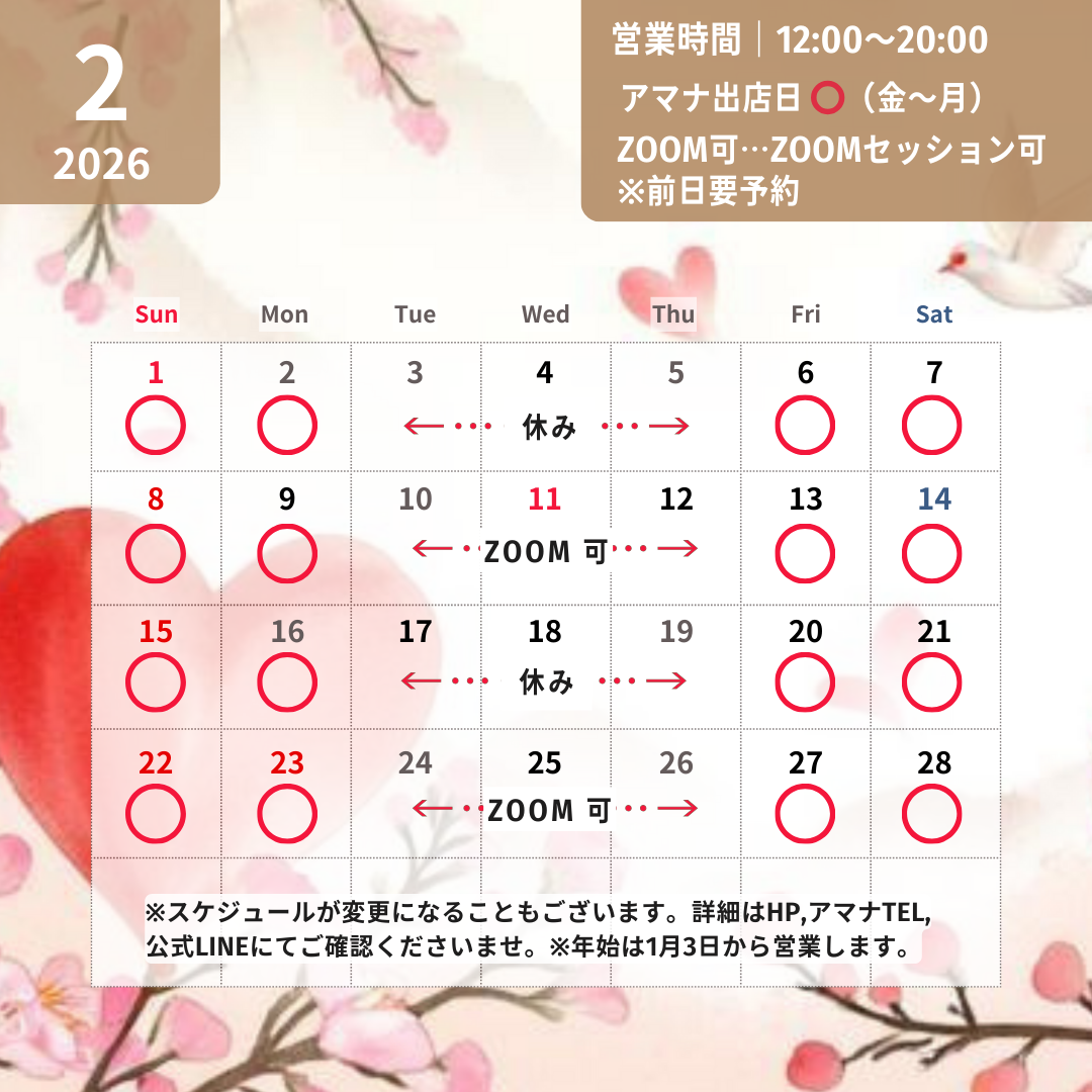 ※都合によりスケジュールが変更になることもございます。予約状況はアマナHPまたは、アマナTELにてご確認くださいませ。